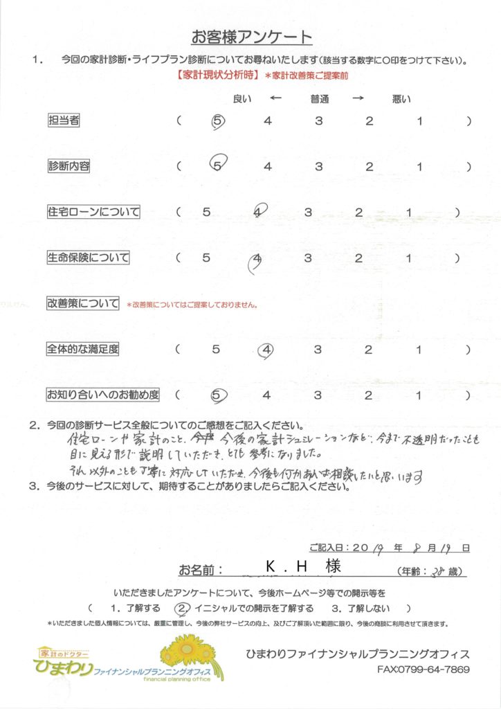 「住宅ローンや家計のこと、今後の家計シュミレーションなど、今まで不透明だったことを目に見える形で説明いただきとても参考になりました。