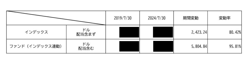 ある銘柄の、インデックス(指標)と、実際のファンドの5年間の運用差、です。