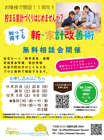 いつもありがとうございます(^^)。 ひまわりFPオフィス田村です。 おはようございます。 米大統領選、決着つきませんね。 なかなか理解できない事ばかりで逆に面白いです(^_^;)。 どちらが選出されるにせよ、今は静観。 日々の業務に励みたいと思います(^^)。 本日の朝刊、 淡路市商工会の共同チラシ が折り込まれました。 弊オフィスもその中に掲載頂いております。 以前よりご案内しております 「新 […]